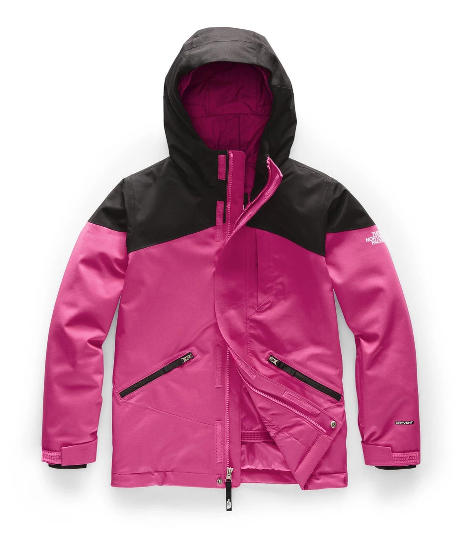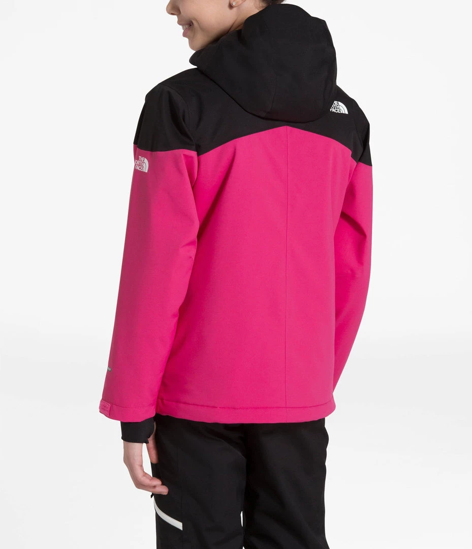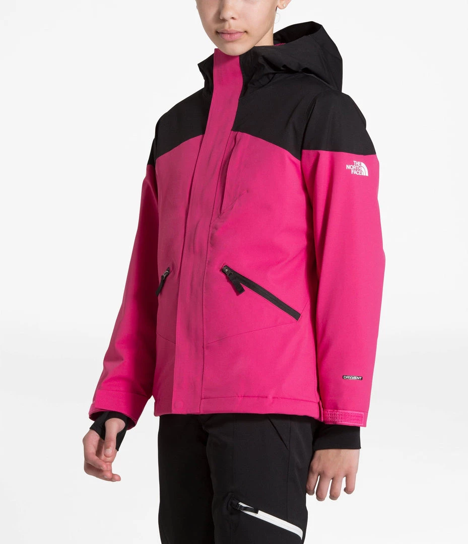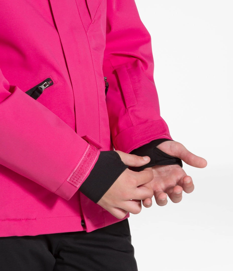 The North Face Girls Lenado jacket is an incredible jacket, with some unique features, and a very cool look! Waterproof, breathable, fully-seam-sealed jacket with stretch for maneuverability while charging hard! The varied insulation that places the most warmth (120 g) at the core, slightly less (80 g) in the sleeves, and light insulation (60 g) in the hood will keep them warm. The internal sleeve cuff with thumb hole keeps the sleeve in place and keeps the snow out, and the sleeve pass pocket has a goggle cloth. Probably one of the nicest features is the built and removable buff to keep the neck and chin warm on those frigid days! The buff stuffs into the collar when not needed!